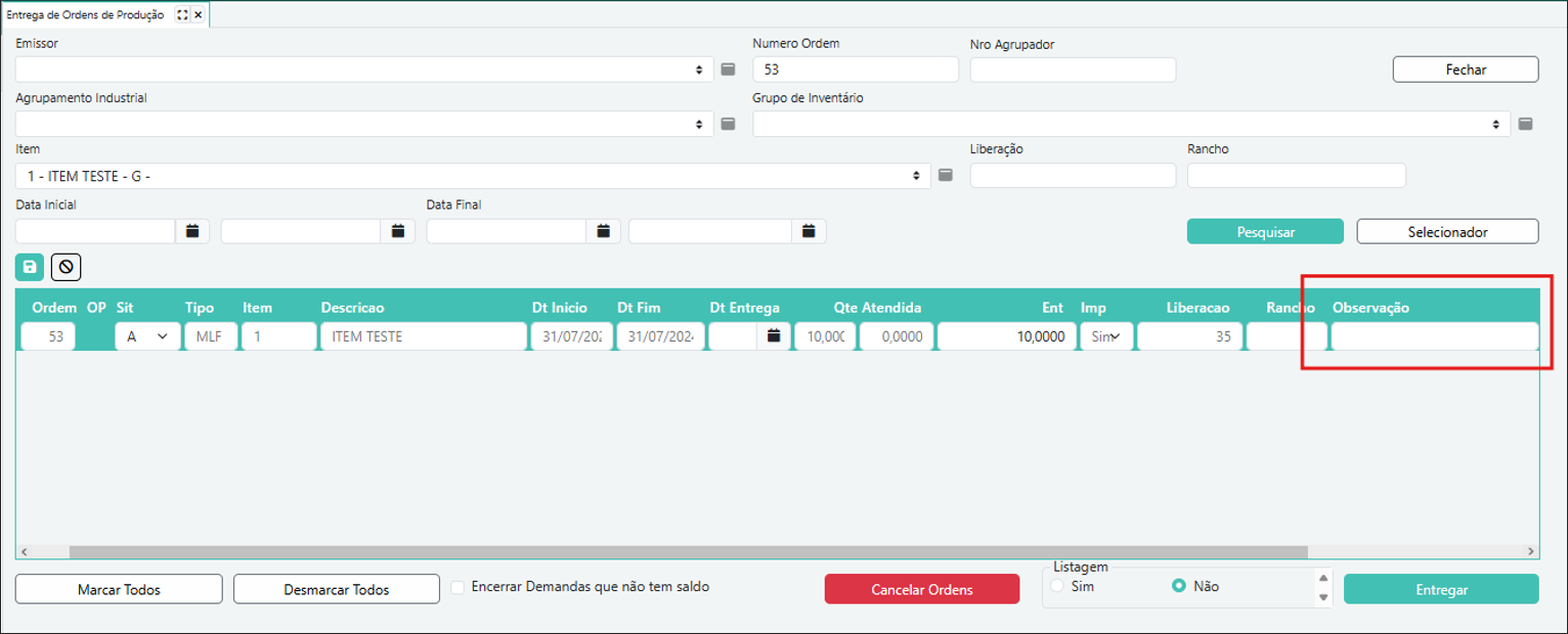 Habilitamos a ediçãodo campo de observação na própria grade de Encerramento de Ordens de Produção.A alteração permite que o usuário registre ressalvas ou detalhes de váriasordens de forma sequencial, sem quebrar o fluxo de fechamento para acessaroutras abas.